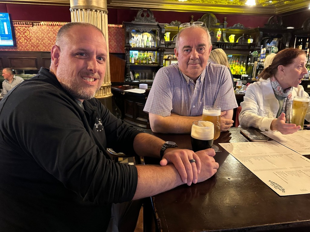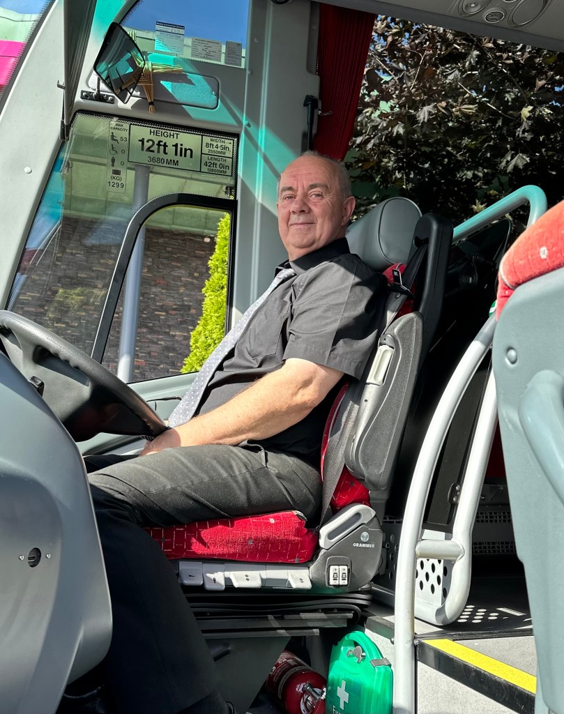 Bill McCauley (l) of Adrian with Declan McNelis at Robinson’s in Belfast, Northern Ireland, June 26, 2023. Bottom photo: Declan behind the wheel of the EF Tours coach, June 2023.